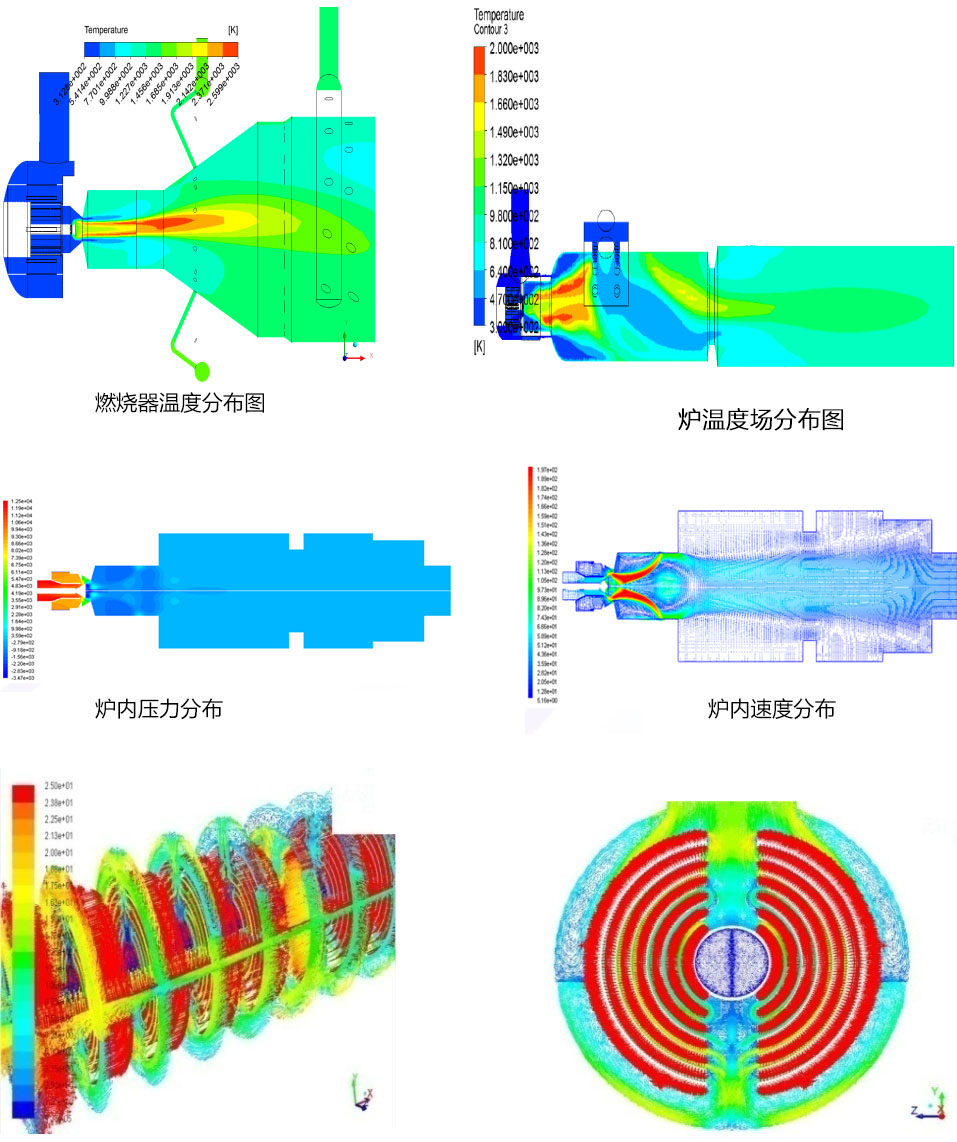 采用目前国际先进的CFD数值模拟技术,对燃烧系统(燃烧器和焚烧炉)的燃烧速度、温度、压力、烟气含量、浓度、流场特性进行模拟分析计算,可对燃烧器旋流系数、喷射角度、焚烧炉膛尺寸及花墙设置等做出指导设计,以达到最优化设计及使用要求。